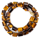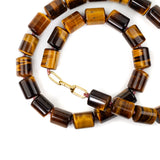 This hand knotted tiger eye necklace is throwing serious 70's vibes. With generous cylinder shaped beads and a solid 18kt gold clasp, it is a piece to treasure. Wear these beads and enjoy their warm inner glow, so beautiful they need no enhancement, just a soft dusty pink silk thread to hold them together on your neck.