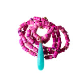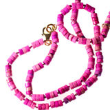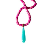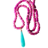 With a nod to the colourful 80's, this hot pink and. pastel blue combination always works together. A 28 x 7mm amazonite drop is set on 9kt yellow gold and hand knotted onto a necklace of hot pink howlite beads. Long enough to sit perfectly on any neckline, this is a sexy, easy wearing piece.