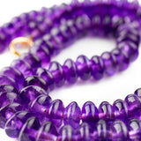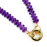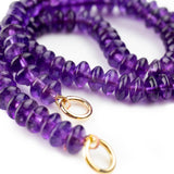 Polished roundel amethyst beads are hand knotted onto silk thread and finished with 9kt gold rings. This juicy statement piece is designed to be worn with one of our 9kt gold connectors (available separately), allowing you to mix and match your favourite pendants, or leave as a simple circle of gold.