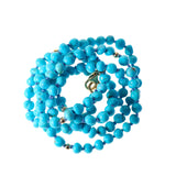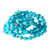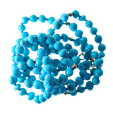 Bright, natural blue turquoise nuggets from the Sleeping Beauty Mine are strung on vibrant blue silk thread and accented with 14kt gold beads. A solid gold clasp makes it easy to wear. This necklace perfectly captures summer’s spirit and is just the right size to wear alone or with a pendant for a sophisticated, stylish look.