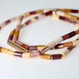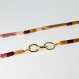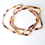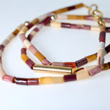 Soft earthy colours are complimented by solid gold details and strung on a sunny yellow silk thread. Perfect summer wearing, this has a boho vibe. The clever subtle 18kt clasp is german made perfection and allows for a light pendant to be added to the necklace should you wish it.