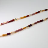 Measures 47.5cm long, beads are approx 5 x 3mm. Jasper, 18kt gold, 14kt gold, 9kt gold, silk.