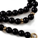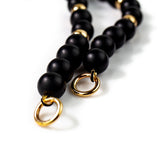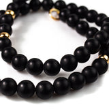 Inky matt black onyx beads are hand knotted on silk and accented with solid gold. Sitting high on the collarbone this necklace is designed for front closure using either our small or large gold circle connectors (available for purchase separately).
