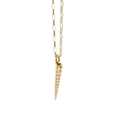 The long spiral found in this shell from Oman is the perfect length for a luxury statement piece. Cast in 18 karat yellow gold, and placed on a circular bail, this simple shell pendant is able to be worn stacked alongside other jewels, or on its own.